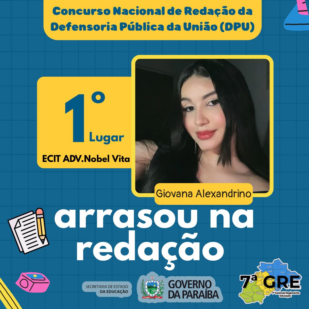 A Paraíba alcançou um resultado histórico na etapa estadual do 8º Concurso Nacional de Redação da Defensoria Pública da União (DPU), e a 7ª Gerência Regional de Educação (7ª GRE) tem muito a comemorar: a estudante Giovana Alexandrino Virgolino, de 19 anos, da Escola Cidadã Integral Técnica (ECIT) Advogado Nobel Vita, conquistou o primeiro lugar no estado, sob a orientação da professora Rita de Cássia Pacheco Sousa.