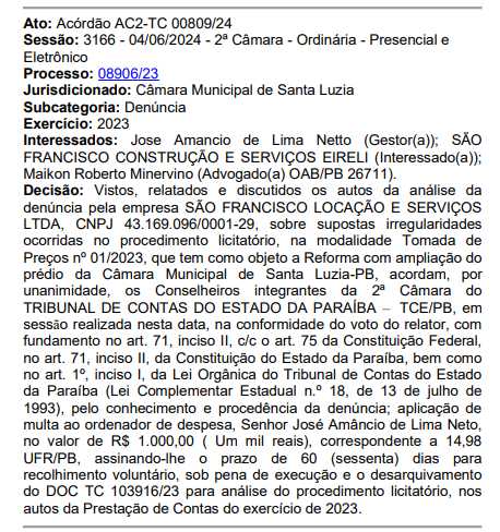 O Tribunal apontou ainda, que a empresa denunciante teve o seu pedido de impugnação indeferido, havendo favorecimento à empresa ÂNGULO CONSTRUÇÕES E SERVIÇOS LTDA, pois participaram do certame oito empresas, tendo as demais sendo inabilitadas justamente por não atender as exigências denunciadas, considerada pelo TCE-PB irregulares. Com isso, o presidente da Câmara de Vereadores de Santa Luzia, José Amâncio de Lima Netto, foi condenado ao pagamento de multa, sendo obrigado a prestar esclarecimento sobre o processo licitatório.