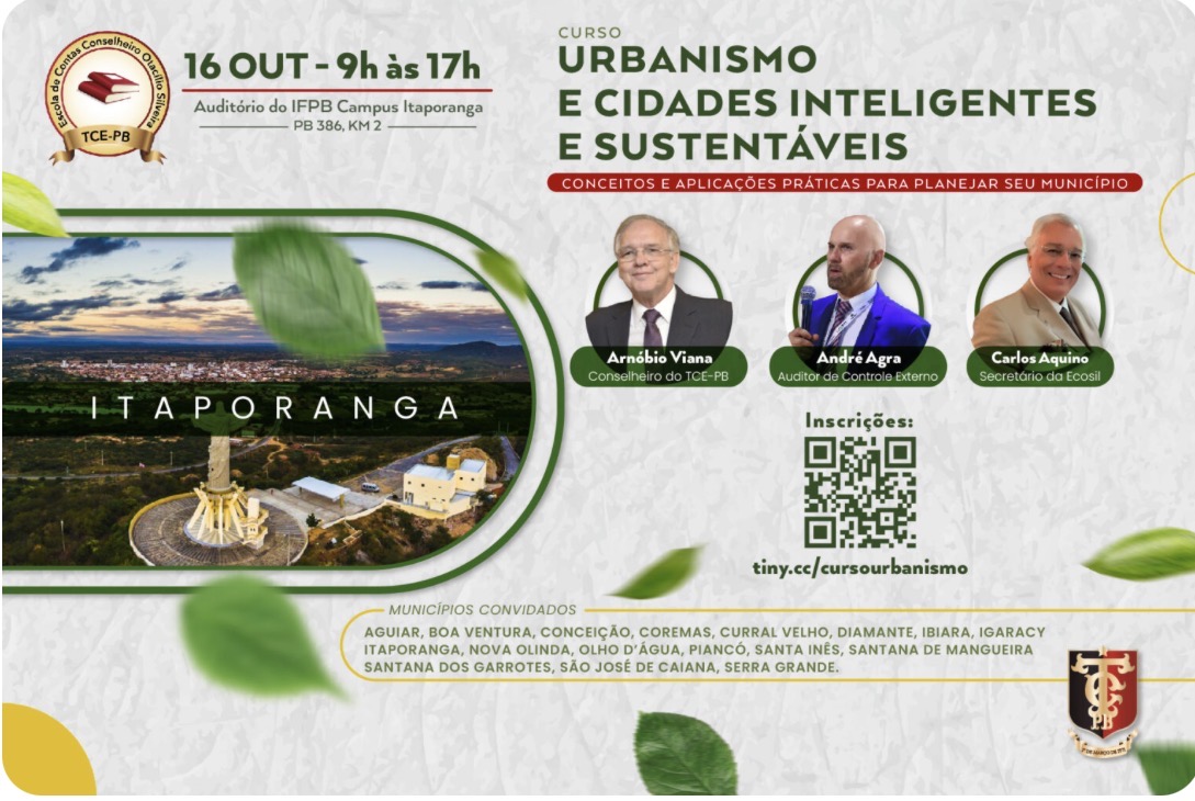 O Tribunal de Contas da Paraíba (TCE-PB), por meio da Escola de Contas Conselheiro Otacílio Silveira (Ecosil), realizará na quinta-feira (16) o curso “Urbanismo e as Cidades Inteligentes e Sustentáveis: como planejar seu município”, voltado a gestores públicos municipais da região do Vale do Piancó. O evento acontecerá no auditório do IFPB – Campus Itaporanga, das 9h às 12h e das 14h às 17h.